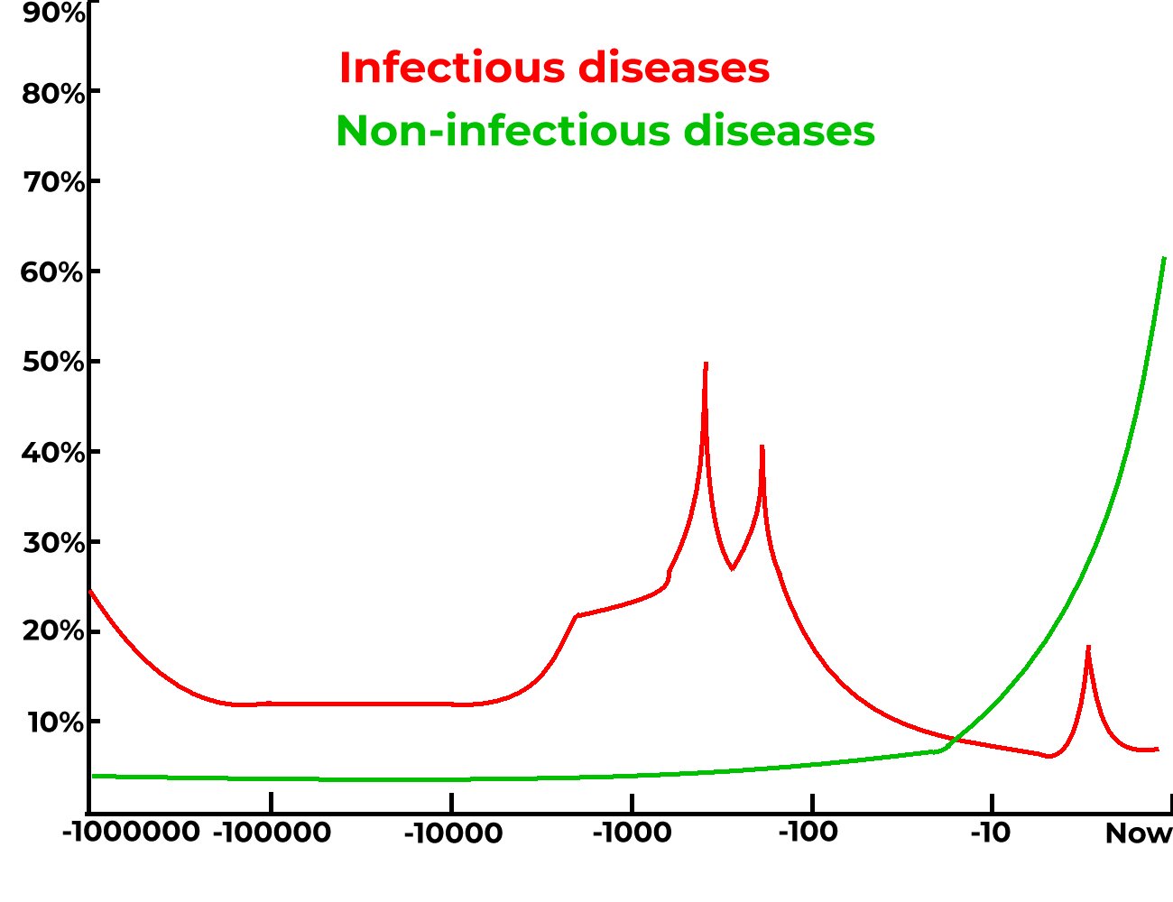 As you can see there are two lines, the red one for infectious diseases, which we know a lot about and are right, and the green one for non-infectious diseases which we think we know a lot about but sadly are wrong.
